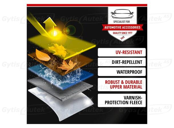 Biltrekket er laget av høykvalitets PVC-belagt polycotton-fleece. Dette materialet gjør produktet vanntett og UV-resistent, noe som er en stor fordel når bilen er utendørs. Innsiden er laget av ultra-myk, lakkvennlig polycotton-fleece og sikrer best mulig beskyttelse for bilens lakk. Dette gjør dette Biltrekket til det ideelle produktet for å beskytte bilen mot regn, is og snø.
